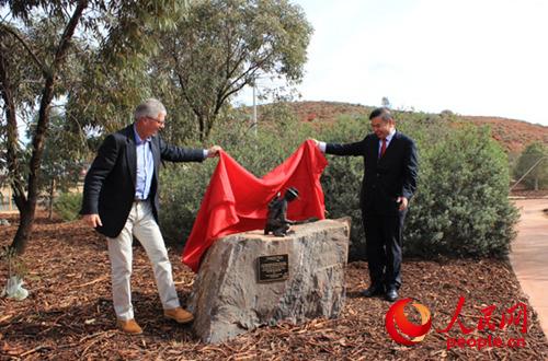 中国紫金矿业执行董事兼副总裁方启学和西澳大利亚政府矿产石油和财政部部长比尔·迈米安共同为纪念仪式揭幕(盛楚宜摄)