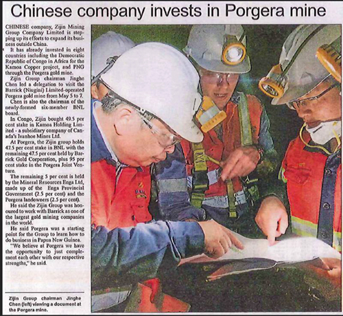 陈景河先生兼任巴理克(新几内亚)有限公司董事长,公司董事会由6位董事组成。他表示,紫金矿业十分高兴与世界最大黄金公司巴理克公司合作。他说“波格拉金矿是紫金矿业在巴新开展矿业开发的学习基地和发力点。我们相信,紫金矿业与巴理克在波格拉的合作能够实现优势互补。”