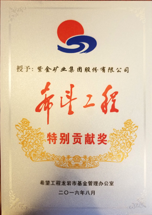 本网讯 8月31日,在由龙岩市团市委、市希望办联合举办的“希望工程2016•圆梦行动”捐赠仪式上,紫金矿业集团获评“希望工程特别贡献奖”。