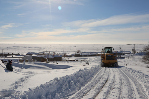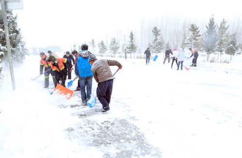 连续降雪天气给山区里的农牧民生活和牲畜安全越冬造成严重影响,通往各农牧村的道路全被大雪吞没,当得知从阿舍勒铜矿—姜居列克村—哈龙沟村47公里道路被大雪封死,村民不能外出,孩子们不能按时上学,老人们不能正常看病。阿舍勒铜矿立即成立抗灾推雪通路突击队,冒着严寒,上路推雪保交通。在即将到达姜居列克村时,目测最深处超过1米。