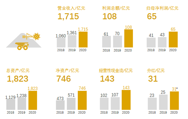 从核心经济指标上看,2020年,紫金矿业以高增幅创下公司成立以来最好水平。其中,销售收入1715.01亿元,同比增长26.01%;利润总额108.46 亿元,同比增长55.51%,归母净利润65.09 亿元,同比增长51.93%,经营性净现金流142.68亿元,同比增长33.78%。截至2020 年12 月底,公司总资产1823.13亿元,较年初增长47.23%。