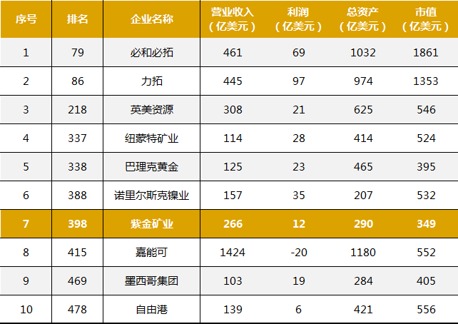 福布斯采用相同权重的四项指标(销售额、利润、资产和市值),并以此对企业排名。从榜单来看,紫金矿业在上榜的34家有色企业中排名第7位,较上年提升2位。有色企业前三名为必和必拓(79位)、力拓(86位)、英美资源(218位)。在上榜的11家黄金企业中,紫金矿业排名第3位,前两名分别是纽蒙特矿业(337位)、巴理克黄金(338位)。