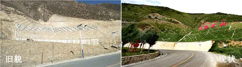 矿区首次在高原尝试应用植生袋、植生毯克服原生土壤贫瘠问题,并在植生袋、植生毯内添加植物生长所需营养物质及相应草籽,取得了良好的生态修复效果。矿区对高陡边坡区域挂网喷播技术进行改进,增设排水、引水设施,减少雨水对边坡的冲刷;在喷播材料中加入粘结剂,有效增加喷播客土附着力,提高草籽存活率。同时,矿区大面积推广使用纤维喷坡修复技术,使喷播绿化施工效率大幅提升。