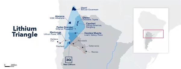 新锂公司核心资产为阿根廷西北部“锂三角”Tres Quebradas Salar(简称“3Q”)锂盐湖项目,总碳酸锂资源量约756.5万吨,平均锂浓度621mg/L,其中有168万吨高品位资源,平均锂浓度高达926mg/L,为全球同类项目中规模最大、品位最高的项目之一,体量在全球主要盐湖中排名前5,品位在全球主要盐湖中排名前3。项目矿权面积353平方公里,覆盖整个盐湖表面和卤水湖,且资源杂质低、开发条件好,具有较好找矿前景和较大扩产潜力。
