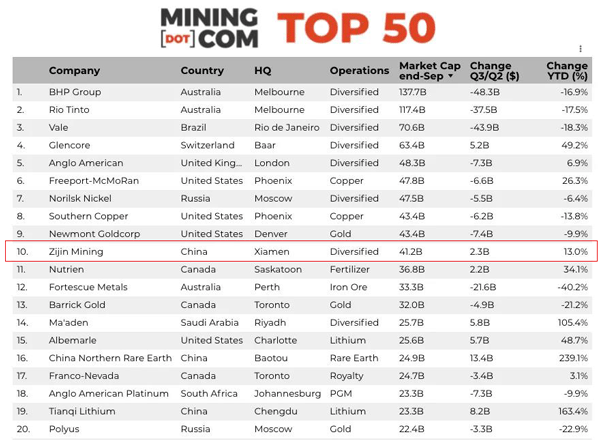 本网讯 近期,MINING.COM发布了2021年第三季度全球市值最高的50家矿业企业名单,紫金矿业位居第10名,领衔中国矿业企业。