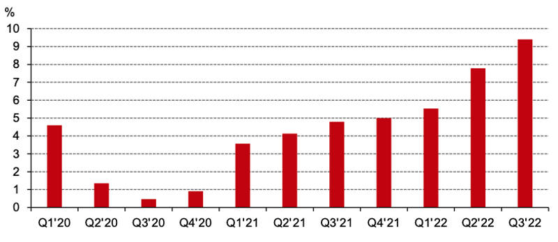 全球黄金平均总维持成本(AISC)创历史新高。根据Metal focus数据,2022年第三季度全球黄金行业的平均总维持成本(AISC)环比增长1%,创下1289美元/盎司的历史新高,平均ASIC比去年同期高出14%,比2020年三季度高出32%,全球头部金矿商同样遭受成本攀升之苦,成本平均上扬10%以上。能源电力要素成本上升是主要原因,特别是在俄乌冲突之后,欧美能源危机进一步恶化,柴油和电力价格不断上扬,再加上硝酸铵和人工成本的上涨,矿产金生产商遭遇前所未有的成本压力。