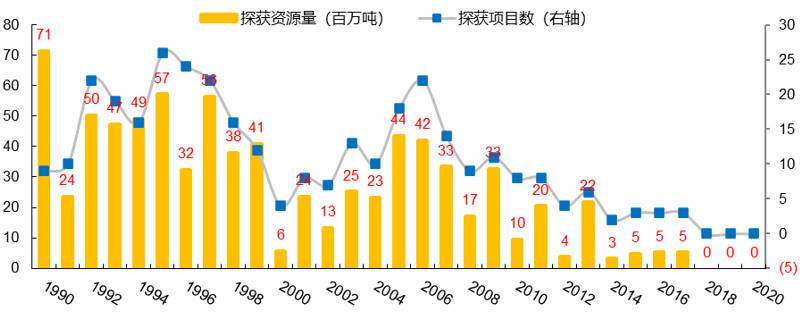图表10:1990-2020年全球黄金探获项目数和探获资源量(资料来源:标普财智)