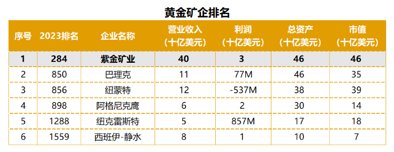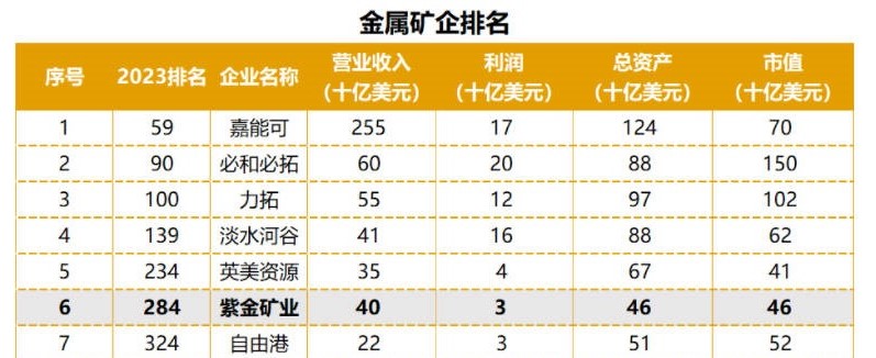 在上榜的全球金属矿企中,紫金矿业进入第6位,较去年前进1位。全球金属矿企前六名为:嘉能可(59)、必和必拓(90)、力拓(100)、淡水河谷(139)、英美资源(234)、紫金矿业(284)。其中,嘉能可上升32位。在上榜的全球黄金企业中,紫金矿业继续保持第1位,第2、3位分别是巴理克(850)、纽蒙特(856)。