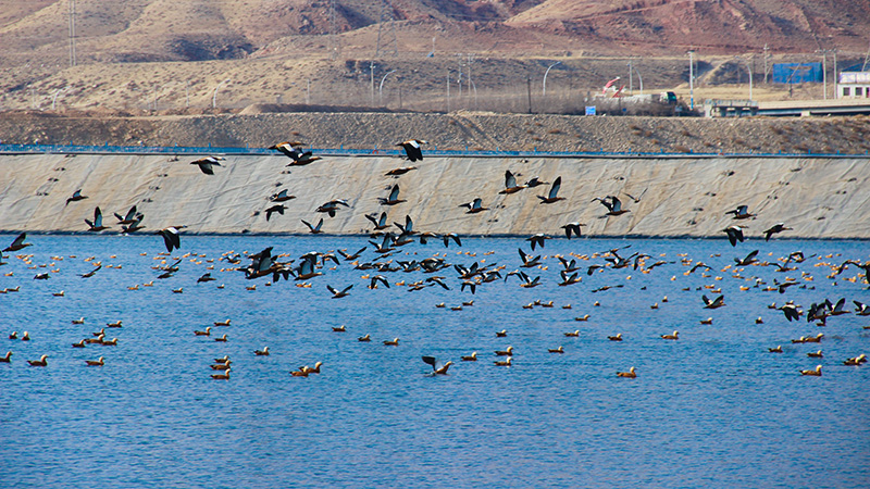 乌后紫金矿井水调节池成“生态驿站” 赤麻鸭组团栖息