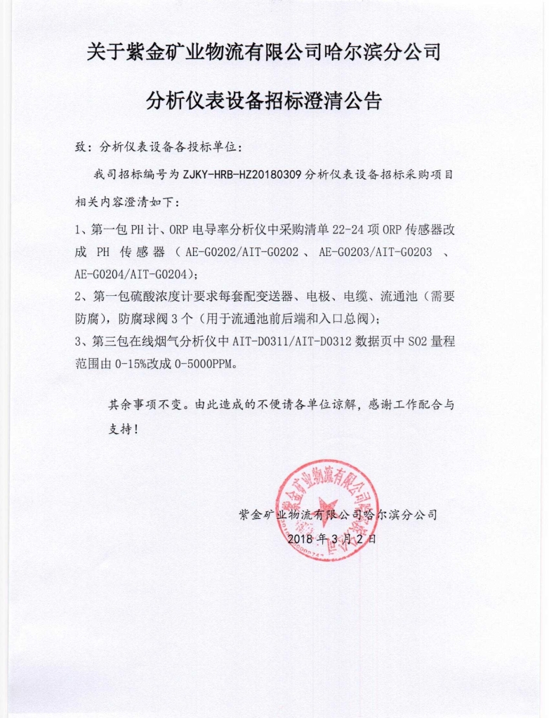 紫金矿业物流有限公司哈尔滨分公司分析仪表采购项目补充公告