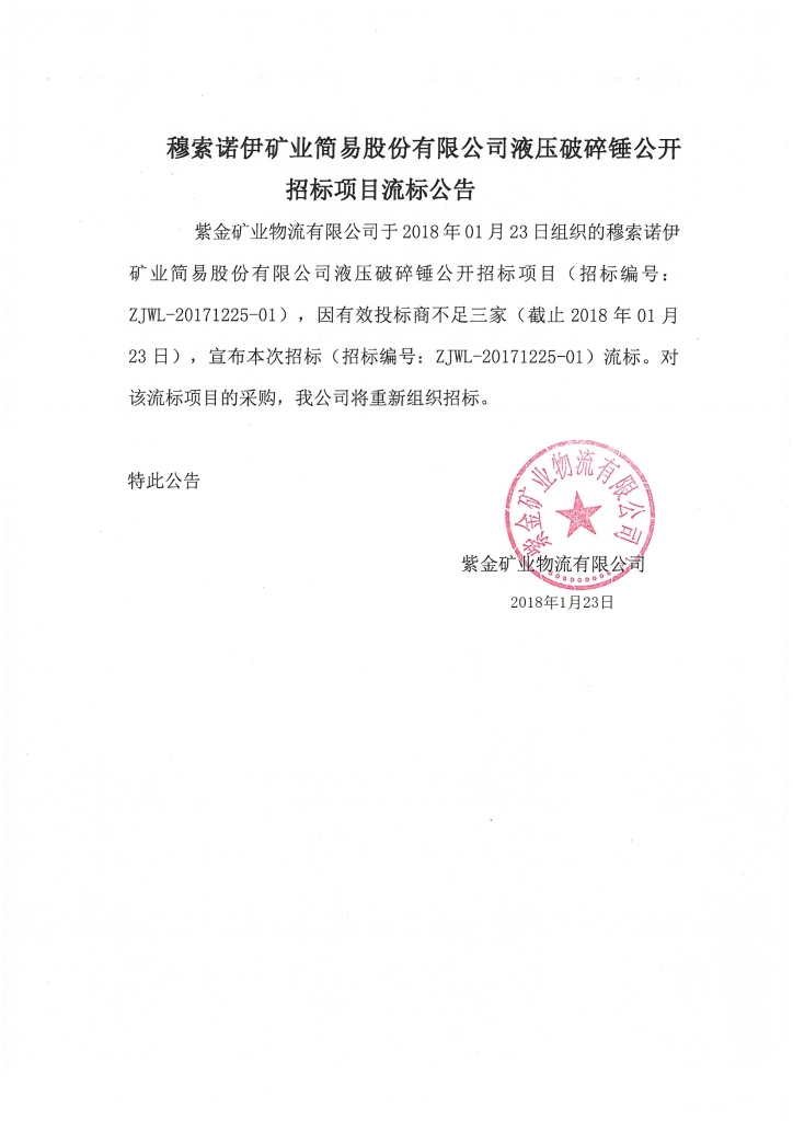 紫金矿业物流有限公司(刚果金)液压破碎锤采购项目流标公告
