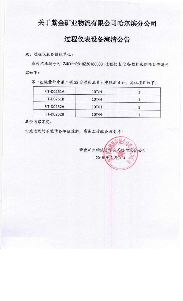 紫金矿业物流有限公司哈尔滨分公司(多宝山铜业)选矿过程仪表采购项目澄清公告2