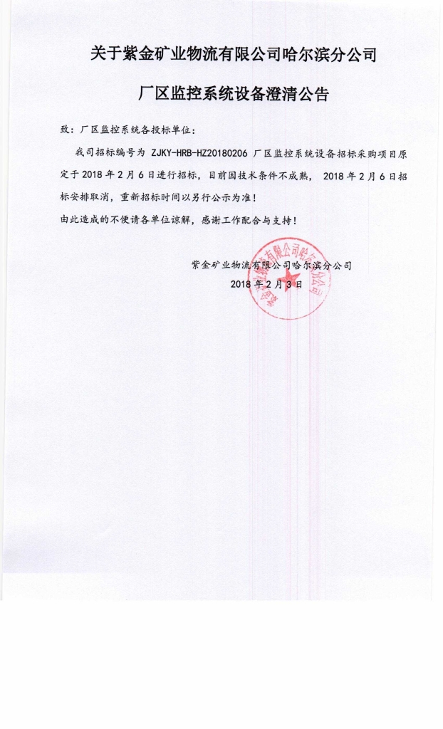紫金矿业物流有限公司哈尔滨分公司监控系统采购项目补充公告3