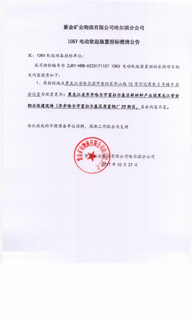 紫金矿业物流有限公司哈尔滨分公司10KV电动机软起动装置采购项目补充公告