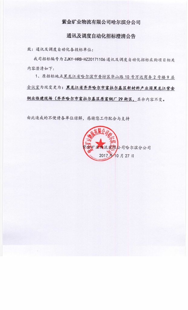 紫金矿业物流有限公司哈尔滨分公司110KV变电站通讯及调度自动化采购项目补充公告