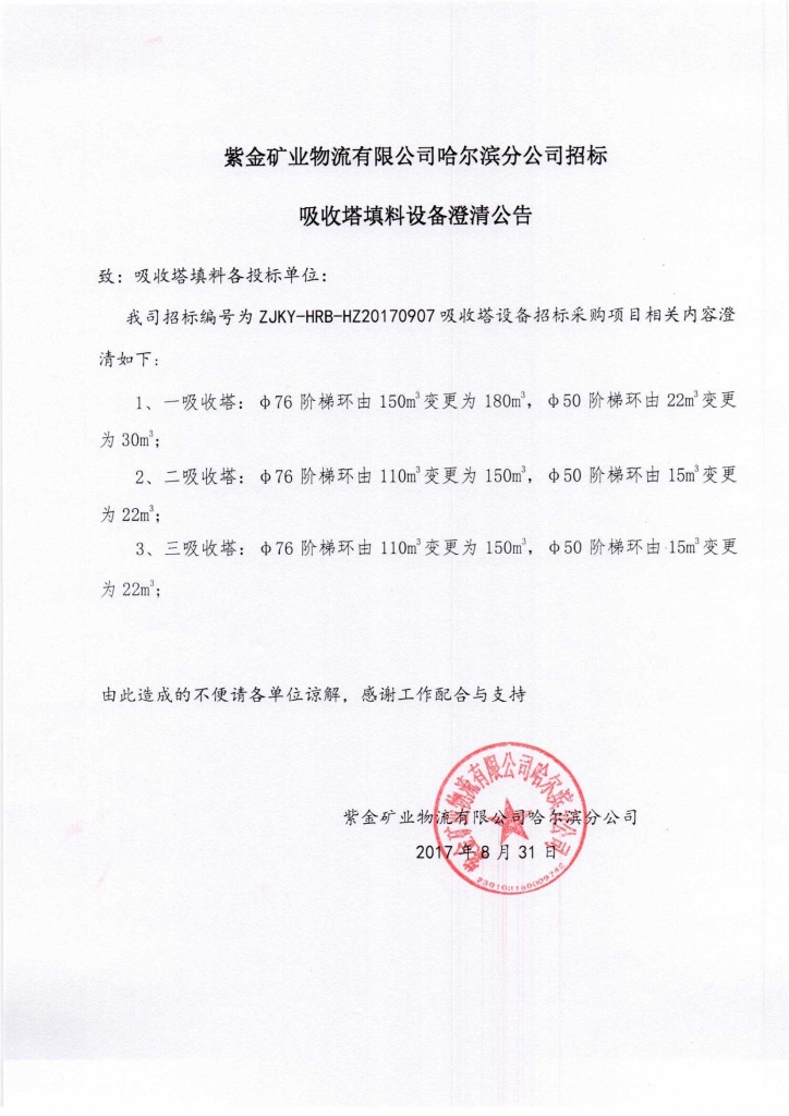紫金矿业物流哈尔滨分公司吸收塔填料采购项目补充公告2