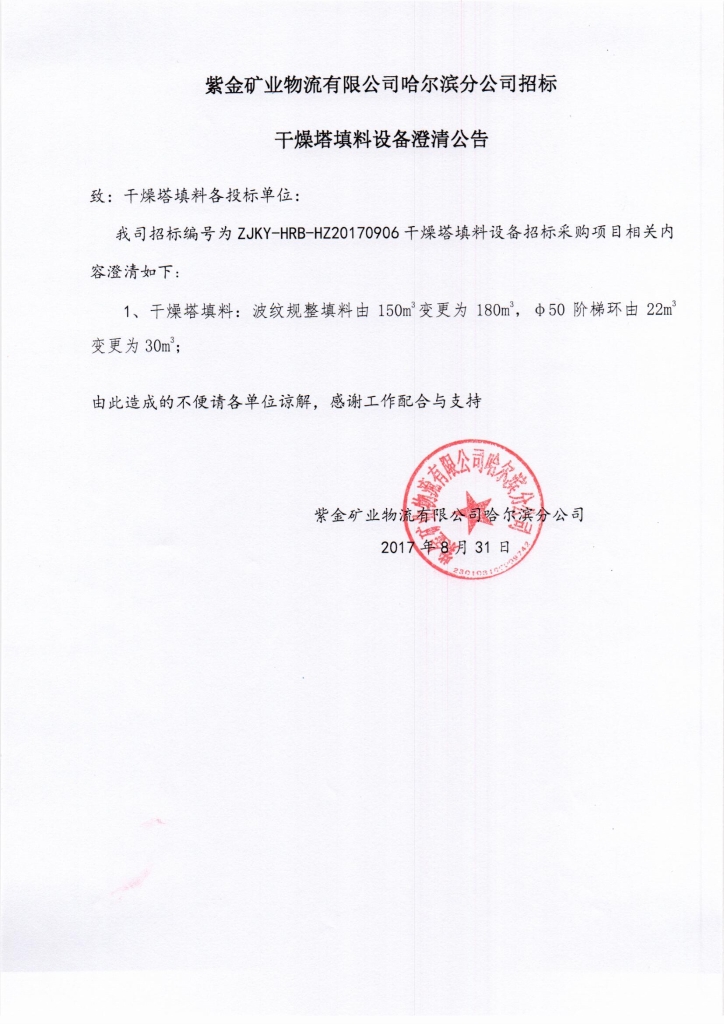 紫金矿业物流有限公司哈尔滨分公司干燥塔填料采购项目补充公告2