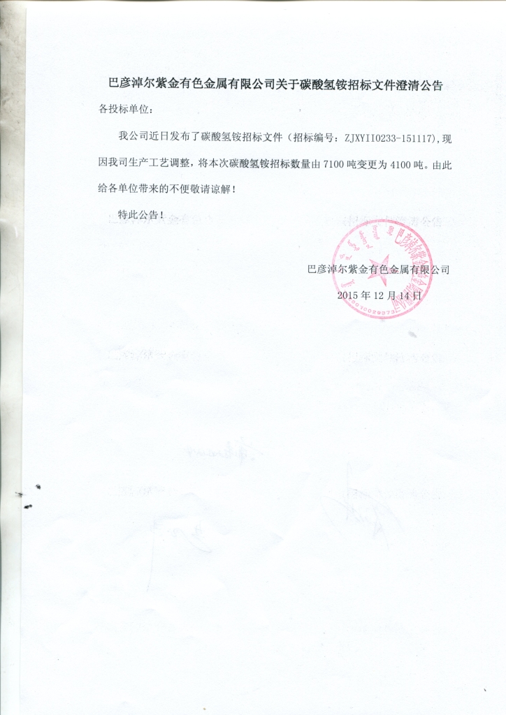 巴彦淖尔紫金碳酸氢铵招标文件澄清公告785
