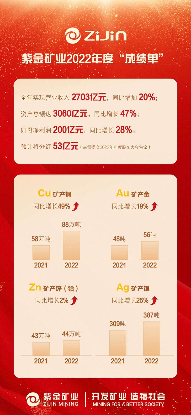 本网讯 3月24日,紫金矿业发布2022年年报,公司各项经营指标再创历史新高,实现营业收入2703亿元,利润总额300亿元,归母净利润200亿元,增幅均超过20%,创下历史新高。
