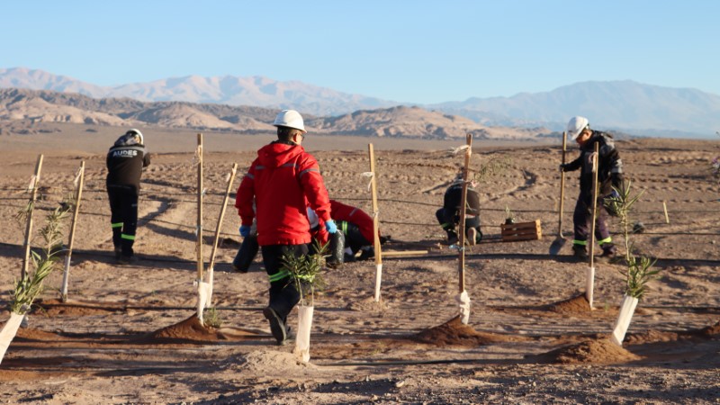 本网讯 近日,紫金矿业旗下阿根廷3Q项目第二阶段造林项目正式启动,锂业科思员工挖坑、搬树苗、钻孔、安装滴灌器,在沙漠种下一株株珍贵的树苗,为项目周边添新绿。